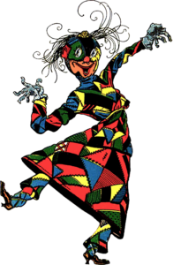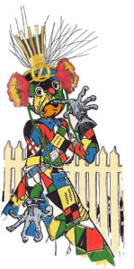 At that moment, a girl in gaudy colors dashed down a nearby path as fast as she could run. Her dress and the girl herself were fashioned from a crazy quilt. It was Scraps, the Patchwork Girl. A magician had brought her to life so she could work for his wife but Scraps quickly ran away to the Emerald City where she could play all day. Work was one thing the Patchwork Girl did not like to do. Just now she was playing tag with an Emerald City insect. “Whoop-te-doodle-do!” she shrieked in laughter. “Fluttering, I’ll soon catch you!” However, the flutter bug darted through a chinaberry plant, causing the berries to tinkle musically as the brushed against each other.